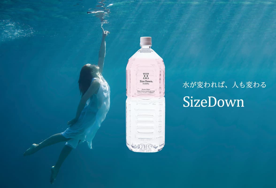 浄水器使用水・水道水・ミネラルウォーターはH2Oの分子集団によって構成されています。サイズダウン(SizeDown)は独自の改水技術により、H2Oの分子集団が小さくサイズダウンしているので、体内への浸透性・吸水性が高いのが特長です。
