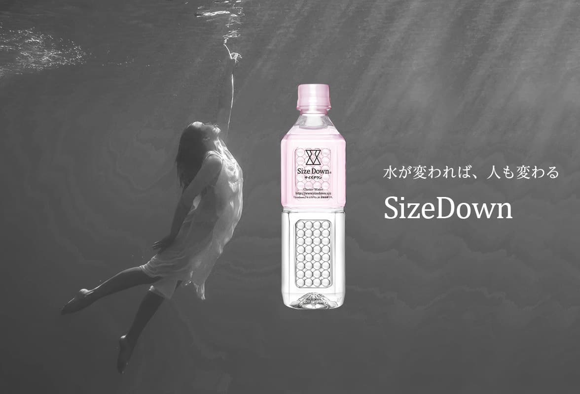 浄水器使用水・水道水・ミネラルウォーターはH2Oの分子集団によって構成されています。サイズダウン(SizeDown)は独自の改水技術により、H2Oの分子集団が小さくサイズダウンしているので、体内への浸透性・吸水性が高いのが特長です。