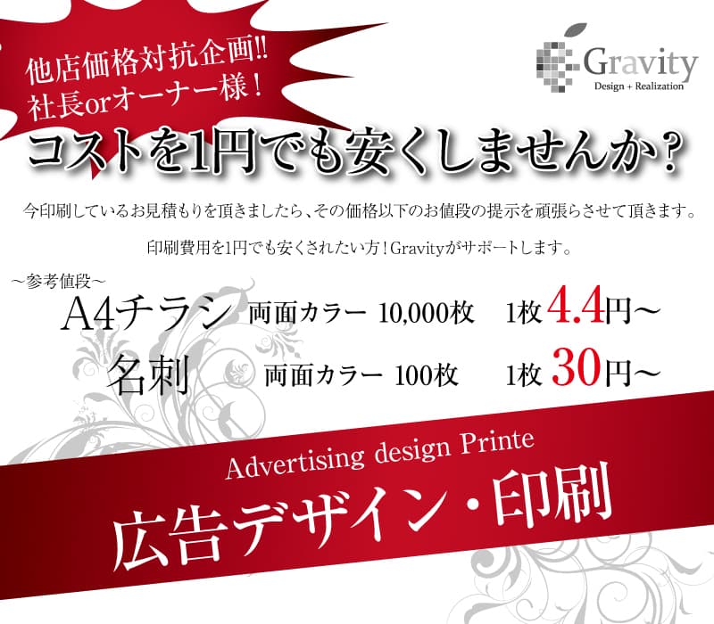 Gravityでは低コストでデザイン&印刷、販促物を制作致します。